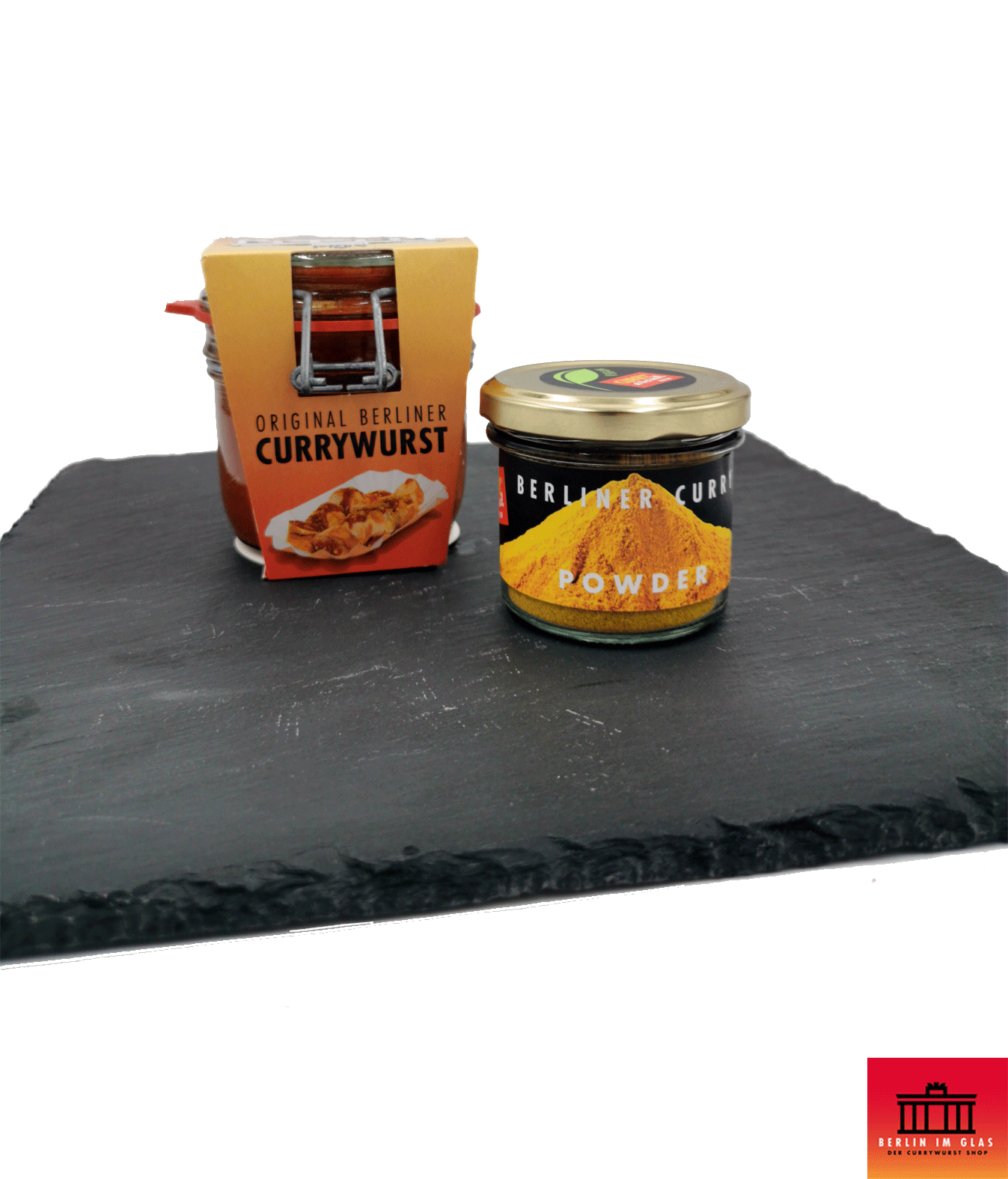 Dieses Set nennen wir auch liebevoll das „Currywurst-Starter-Kit“ denn es beinhaltet alles, was man für eine leckere Currywurst-Mahlzeit braucht. Currywurst im Glas, die ihr ganz einfach im Wasserbad erhitzen könnt, mit einem Glas unseres Original Berliner Curry Pulvers im Glas.